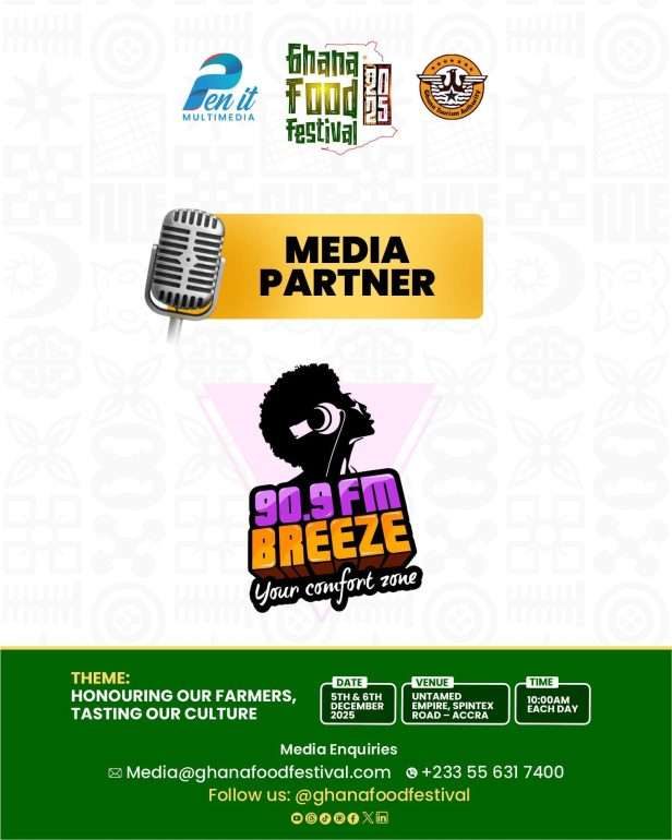 The Ghana Food Festival 2025 is proudly supported by Breeze 90.9 FM  Graphic Communications Group, AdbrandsGH, Veetickets, Ayetickets, EGO Tickets, and Ameyaw Debrah Media.